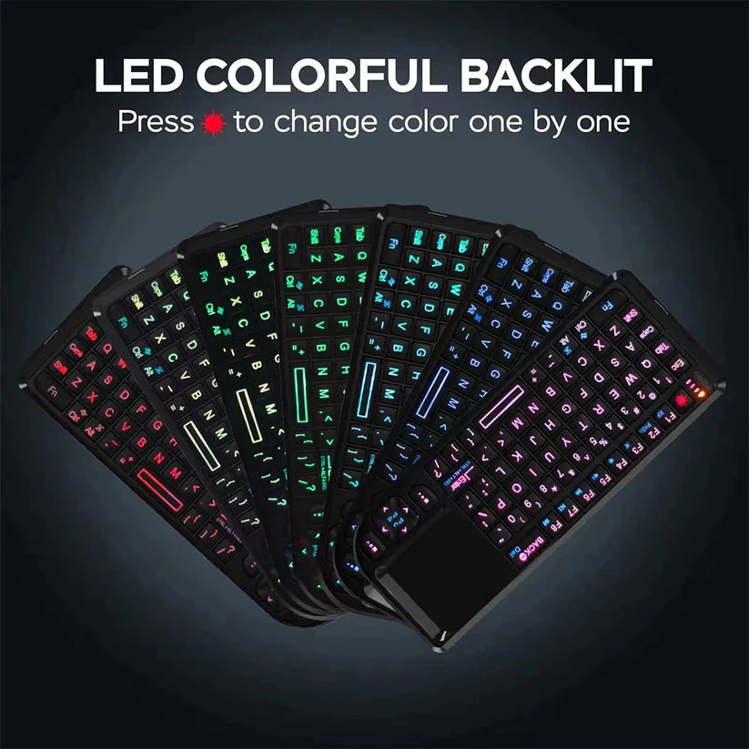 Возьмите полный контроль в свои руки с этой многофункциональной беспроводной клавиатурой компактного и современного дизайна. Благодаря семицветной подсветке, сверхчувствительному тачпаду и встроенному фонарику каждая ваша работа или развлечение превращается в плавный опыт, даже в полной темноте. Эргономичная форма, похожая на пульт от телевизора, идеально ложится в руку для комфортного использования, будь вы на диване или в движении.