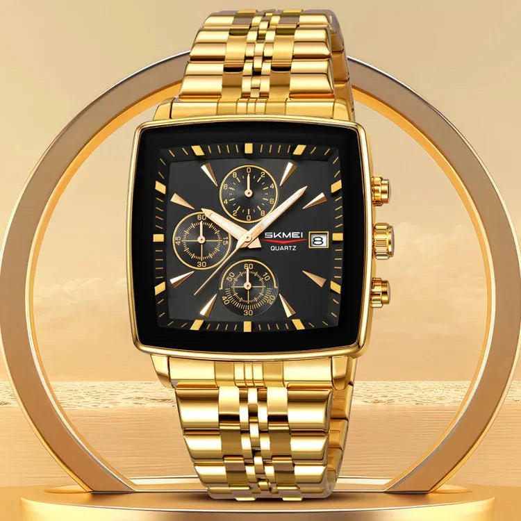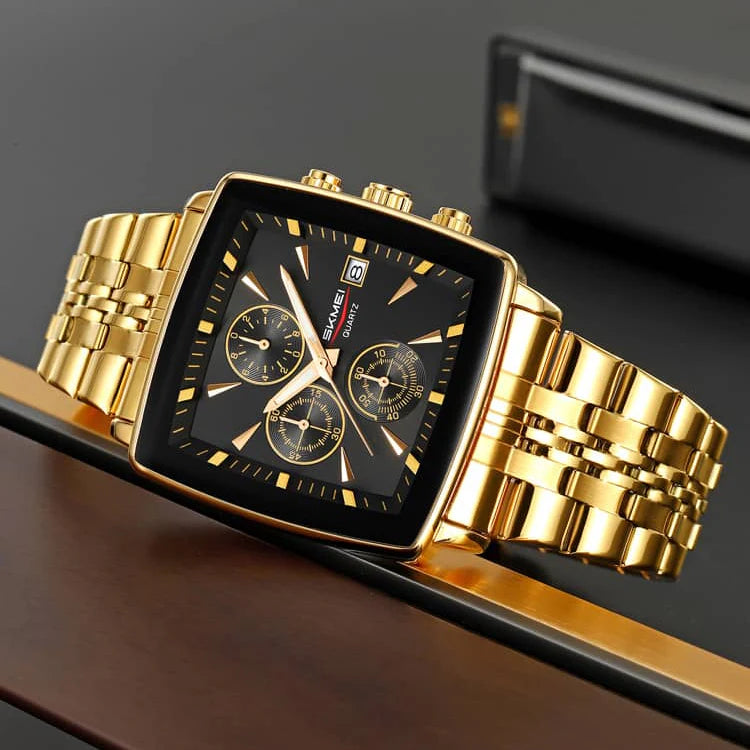 Когда стиль встречается с точностью, рождается SKMEI 2434. Часы с дерзким дизайном, созданные для мужчины, который никогда не остается незамеченным. Квадратный корпус и браслет из нержавеющей стали золотого цвета ловят свет и взгляды, подчеркивая уверенную элегантность. Будь то деловая встреча или вечерний выход — эти часы добавляют штрих утонченности к любому образу.