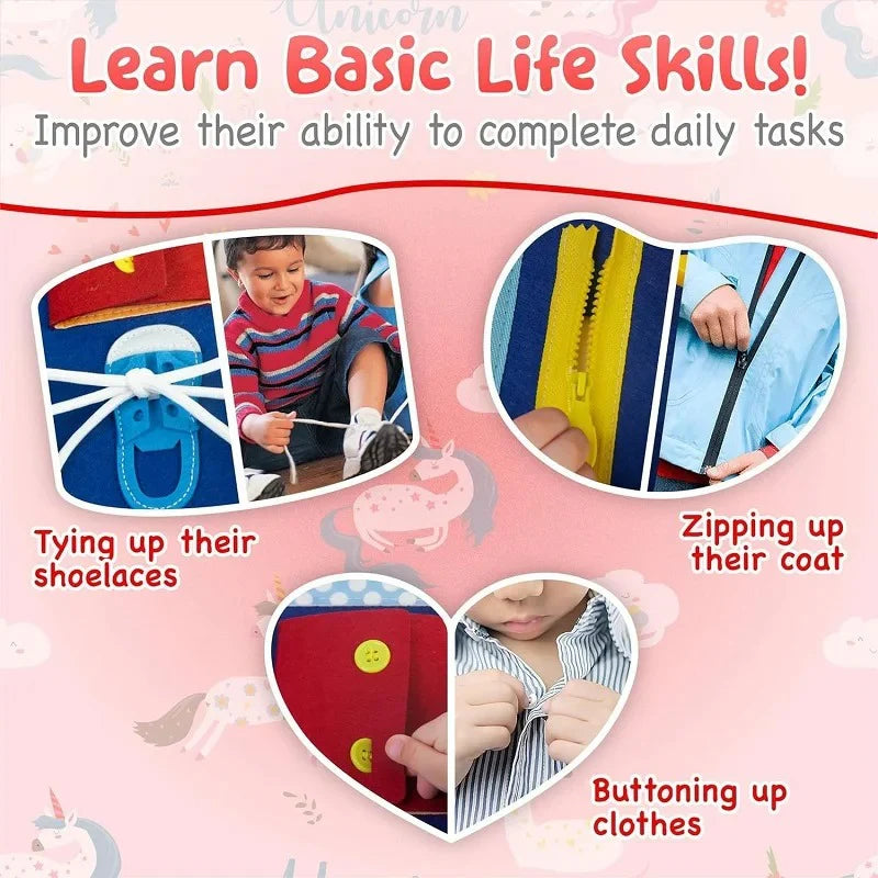 Страницы: 8–12 съёмных страниц с заданиями Активности: застёжки-молнии, шнуровки, пуговицы,