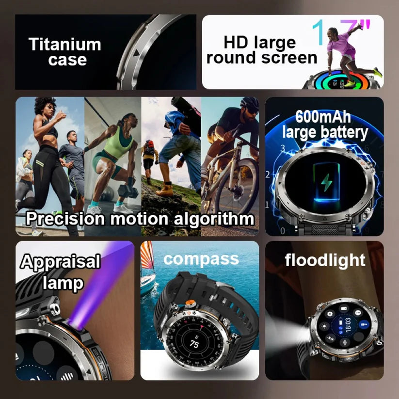 Оснащённые более чем 110 спортивными режимами, HT30 становятся вашим персональным тренером. Часы отслеживают шаги, пройденное расстояние и сожжённые калории, адаптируясь к любому виду активности — от городского бега до горных походов. Протестированные по 12 военным стандартам, они устойчивы к пыли, экстремальным температурам и суровым условиям. Встроенный фонарик, компас и функция SOS делают их незаменимым спутником для исследований без границ.