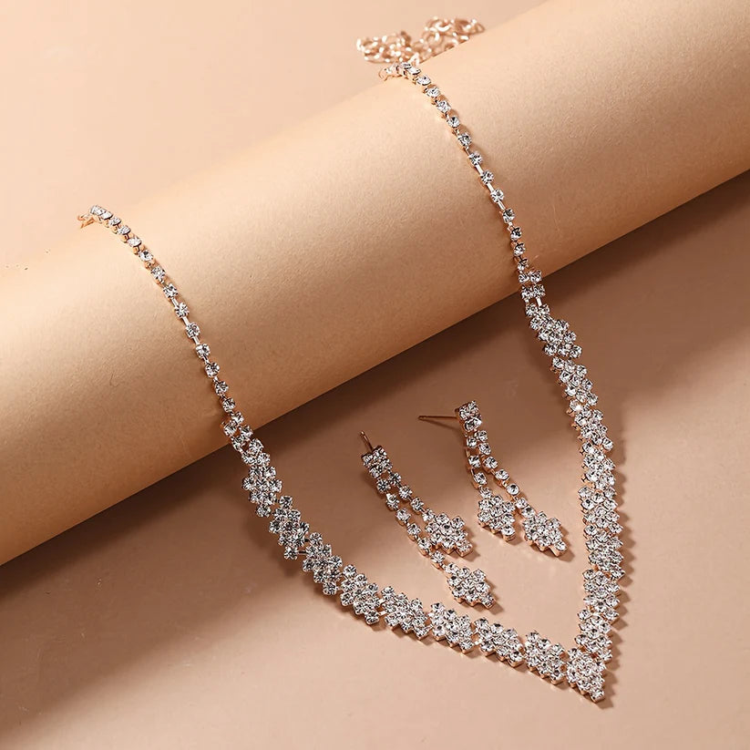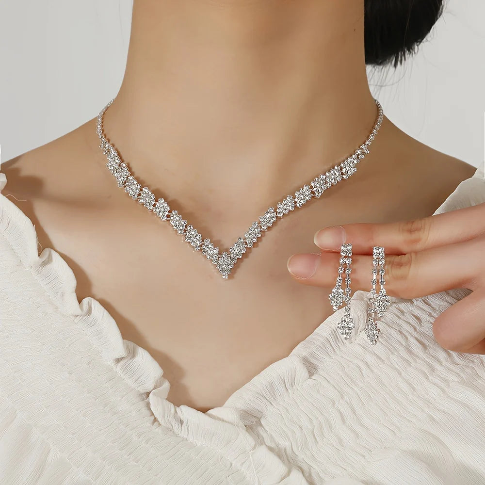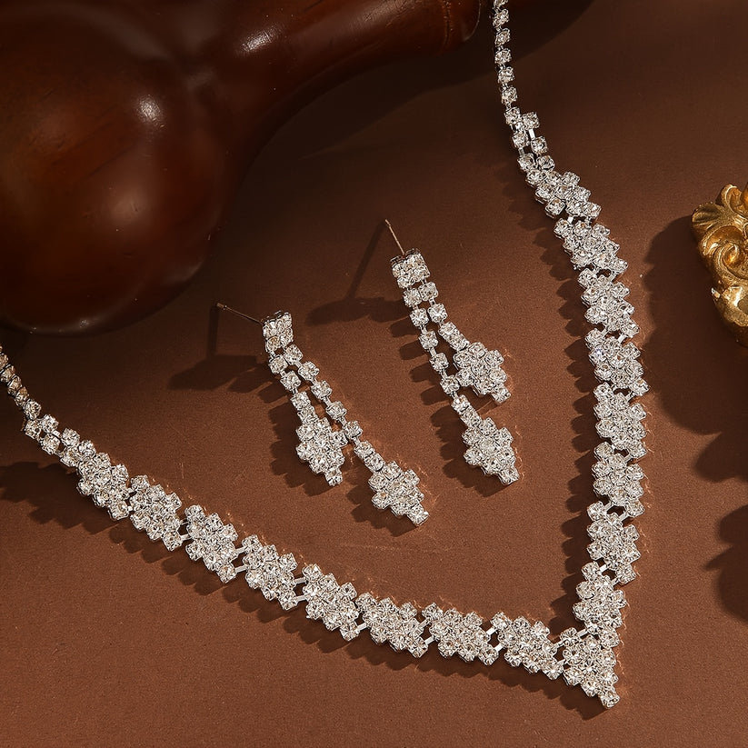 Изготовленный из высококачественного цинкового сплава с серебряным покрытием, он сочетает прочность и утончённость. Аккуратно инкрустированные стеклянные камни улавливают и отражают свет, создавая ослепительный эффект. Благодаря безупречной отделке этот набор идеально подходит для особых случаев — свадьбы, романтического вечера или в качестве памятного подарка.
