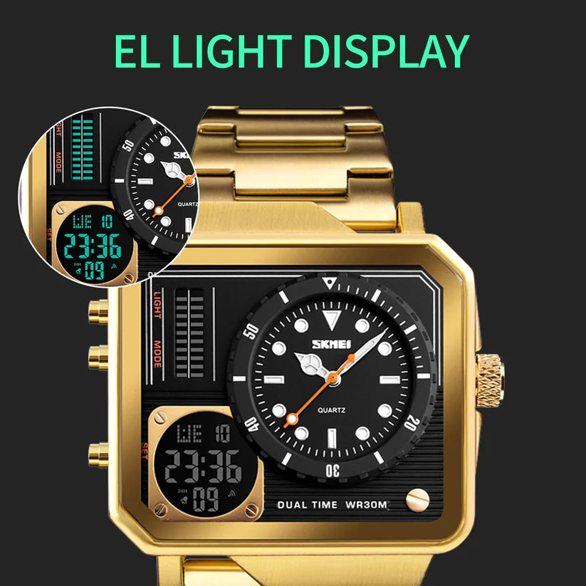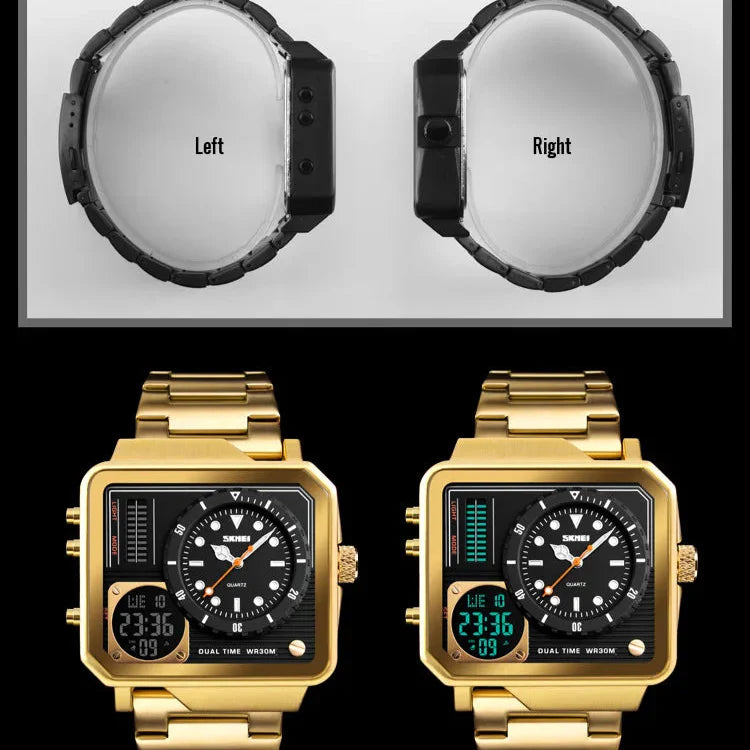 Проявите свой стиль с уверенностью вместе с часами SKMEI — настоящим сочетанием инноваций и характера. С циферблатом с тройным отображением и футуристическим дизайном эти часы не останутся незамеченными. Они позволяют одновременно отслеживать три часовых пояса, что идеально подходит для тех, кто часто путешествует или живет в ритме глобального мира. Широкий LED-дисплей в сочетании с корпусом из нержавеющей стали создают мощное и изысканное впечатление на вашем запястье.