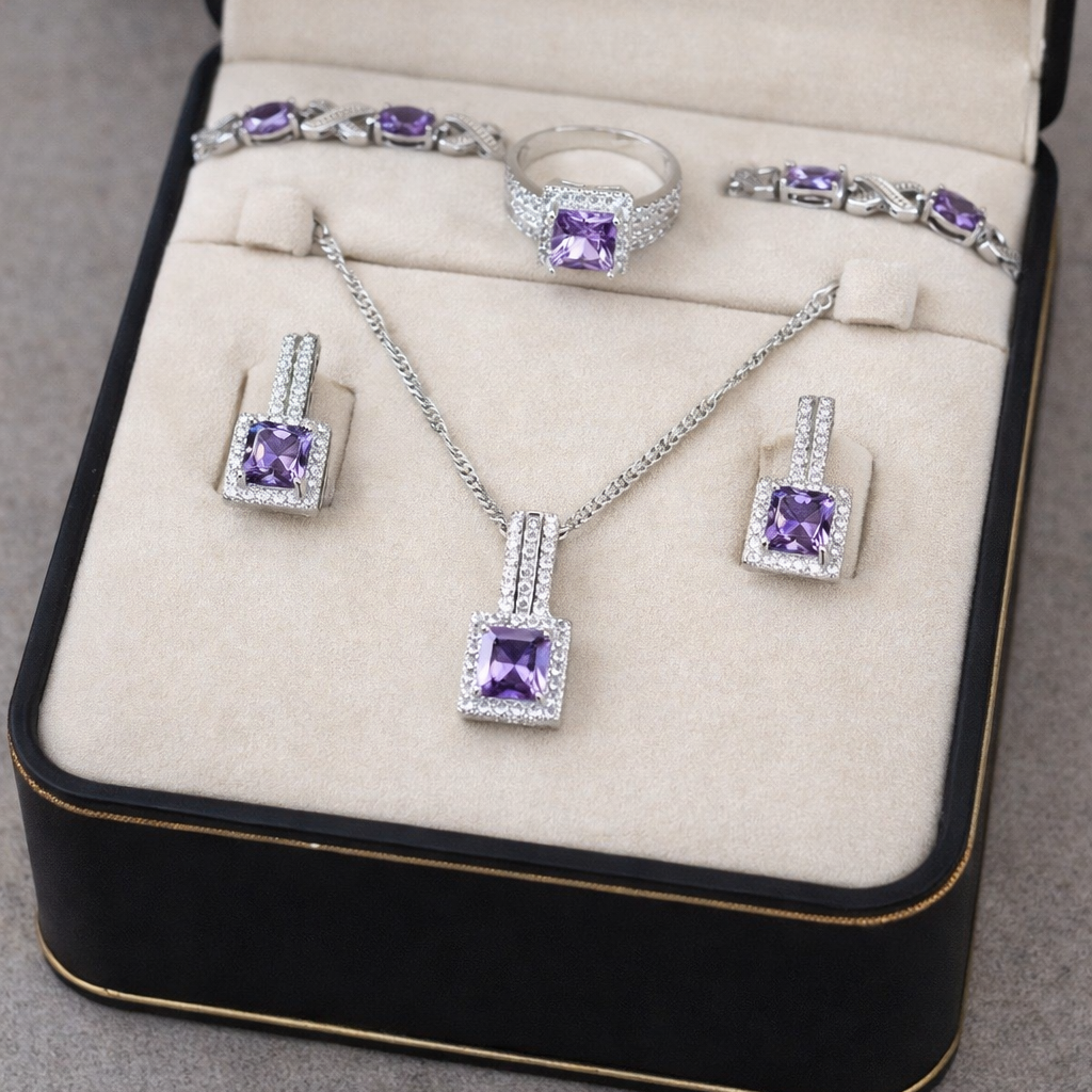 Нежное ожерелье изящно подчёркивает линию шеи, серьги озаряют лицо сиянием, а браслет гармонично завершает образ. Фиолетовый циркон — символ женственности и благородства — прекрасно сочетается с белыми или айвори оттенками свадебного платья, добавляя образу утончённый и изысканный цветовой акцент.
