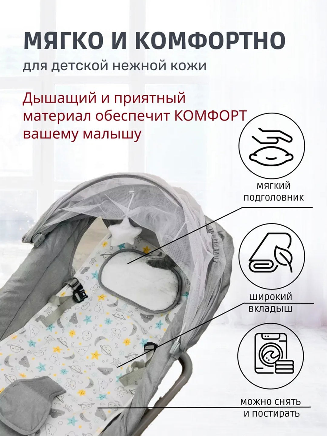 - Продуманные аксессуары максимальный комфорт и радость: В комплект входят мягкая подушка, эргономичная подушка под голову, подвесные игрушки и москитная сетка, создавая безопасное и уютное пространство для вашего малыша.