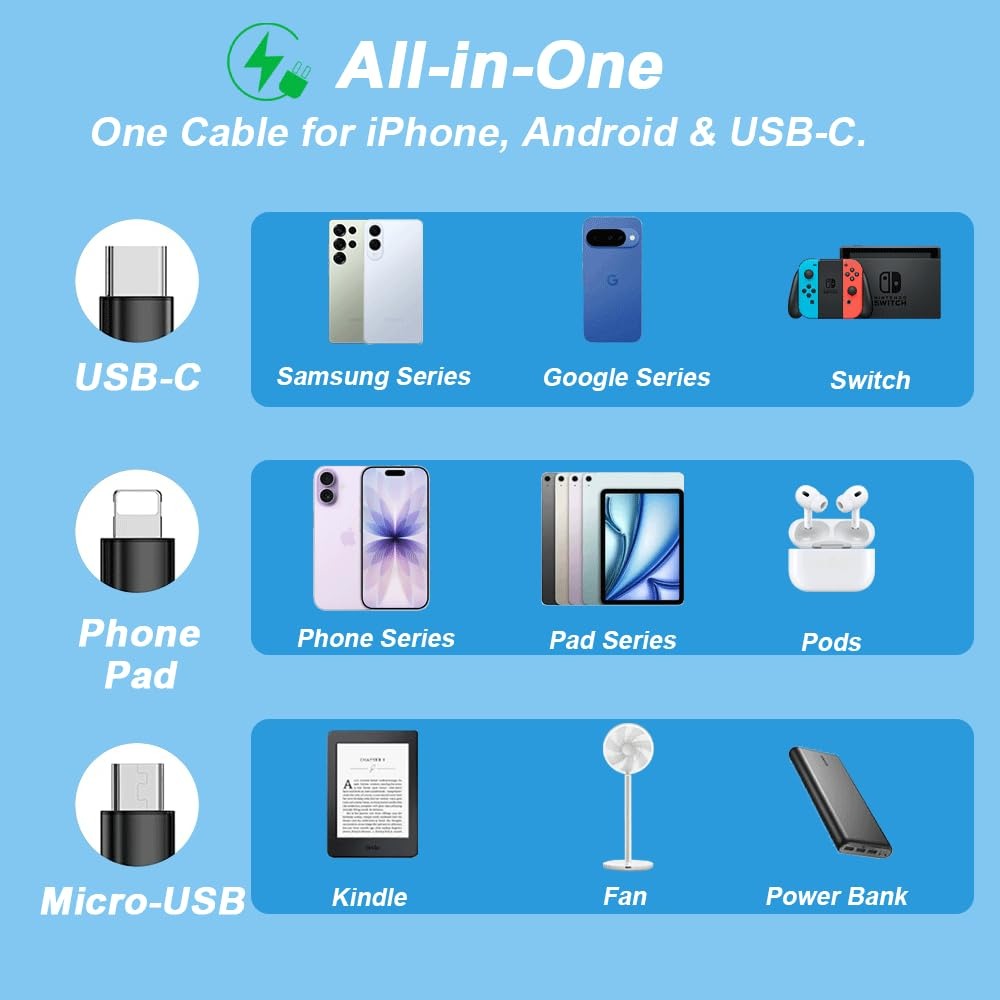 - Универсальная совместимость: Этот кабель поддерживает большинство устройств для зарядки. Порт для телефона совместим с iPhone 17/16/15/14/13/12/11/XS/XS Max/XR/8/SE и iPad Pro, USB-C для Galaxy S25/S24/S23, Micro USB для большинства Android-устройств, планшетов, игровых контроллеров, пауэрбанков и др.