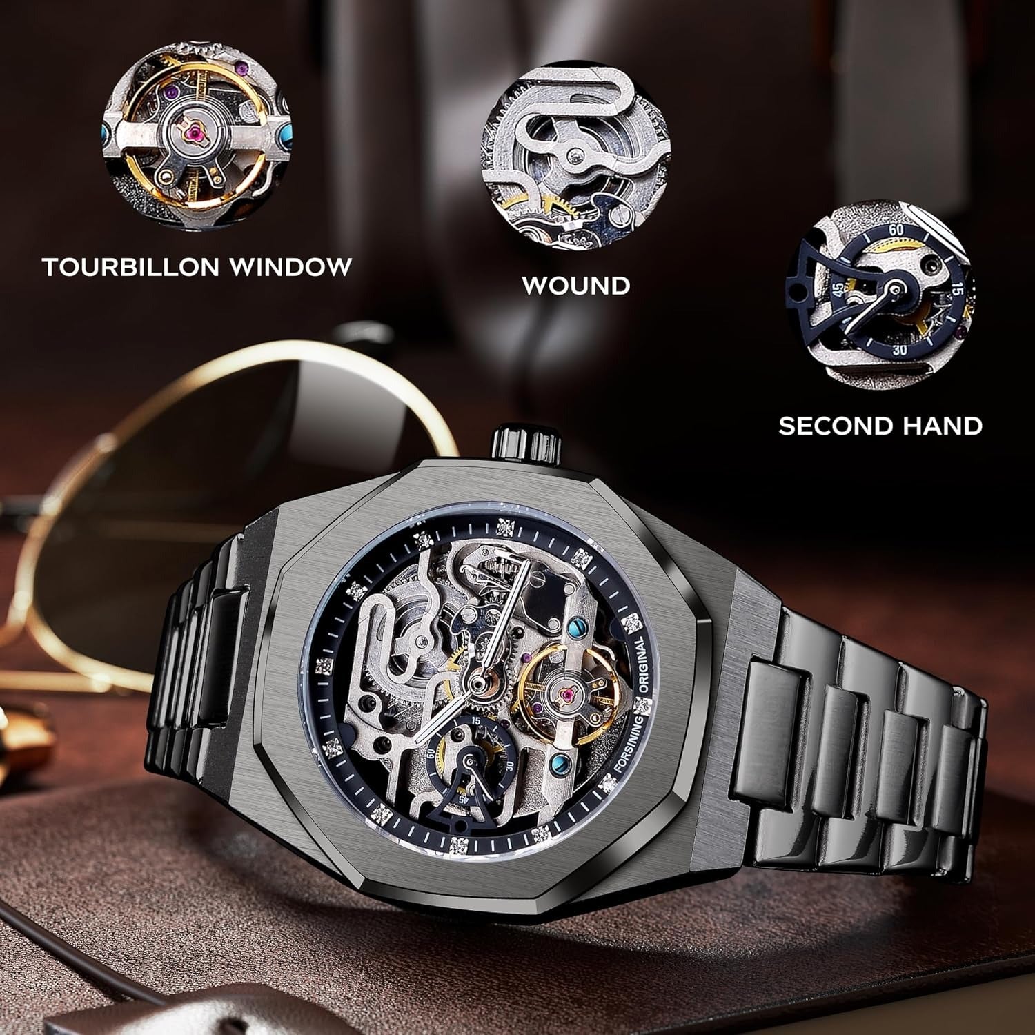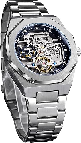 - Восьмиугольный безель обработан с использованием полировки и шлифовки, что обеспечивает устойчивость к царапинам и подчёркивает две разные металлические текстуры. Крупный циферблат диаметром 1,61 дюйма обеспечивает отличную читаемость, а высококачественный браслет из нержавеющей стали повышает прочность часов. Общая длина часов составляет 8,26 дюйма, что обеспечивает комфортную и элегантную посадку на запястье.