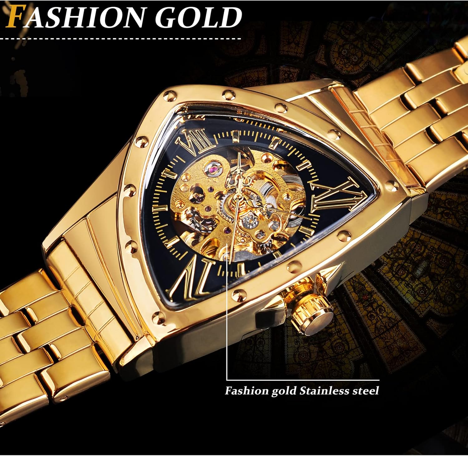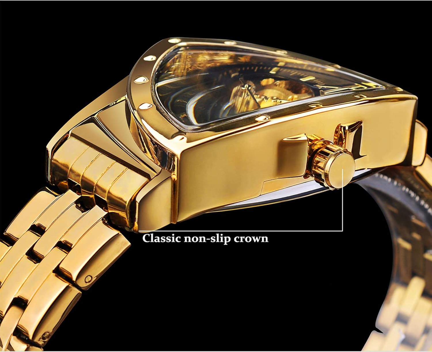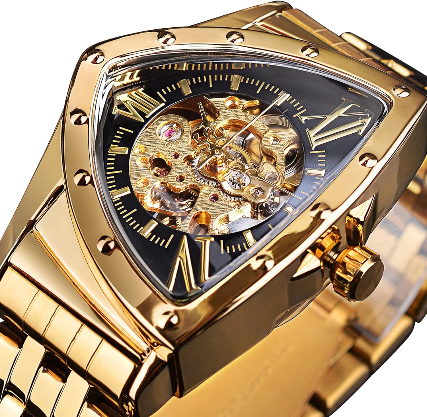 - Часы отличаются уникальным треугольным дизайном, который сочетает в себе роскошь и смелость одновременно. Их блестящий золотой корпус и открытый циферблат (Skeleton) придают им исключительный характер, привлекающий внимание с первого взгляда, делая их ярким акцентом любого образа.