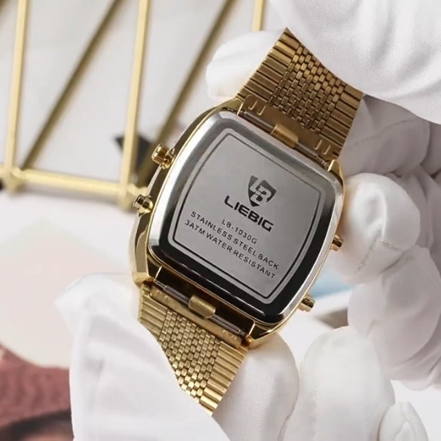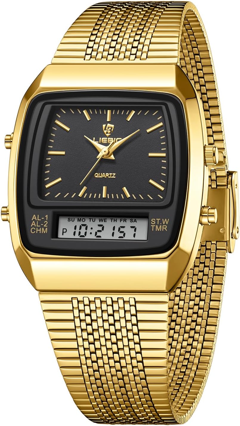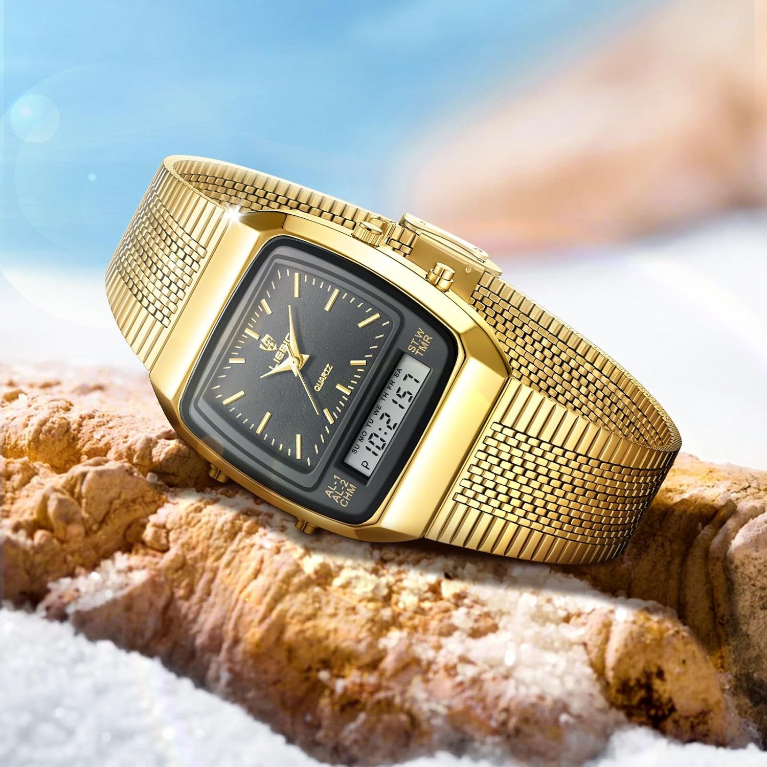 - Стильный квадратный циферблат: Ретро-дизайн квадратного корпуса с чёткими метками и цифровыми функциями придаёт часам современный и смелый стиль, подходящий как для повседневной одежды, так и для официальных мероприятий.