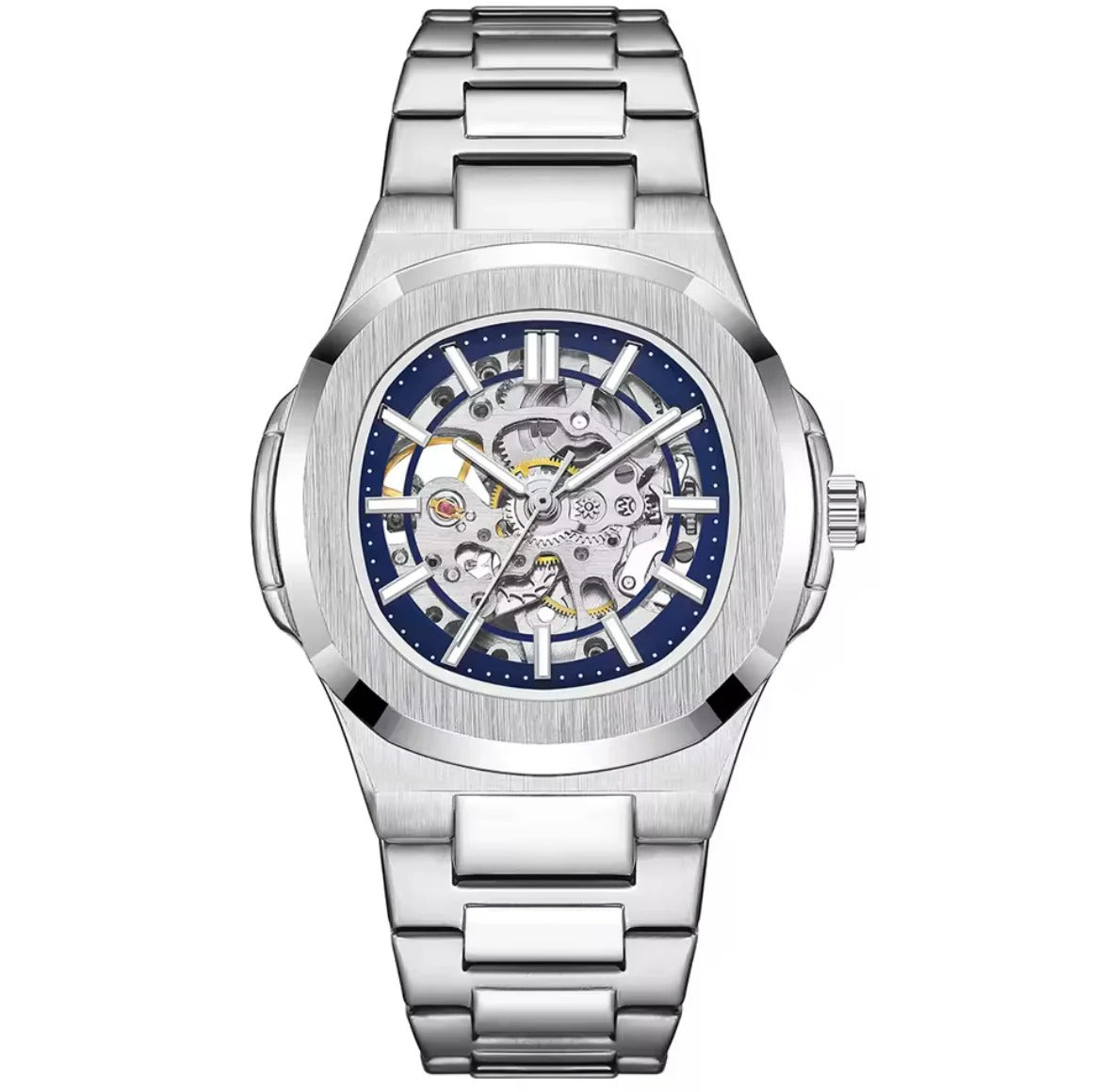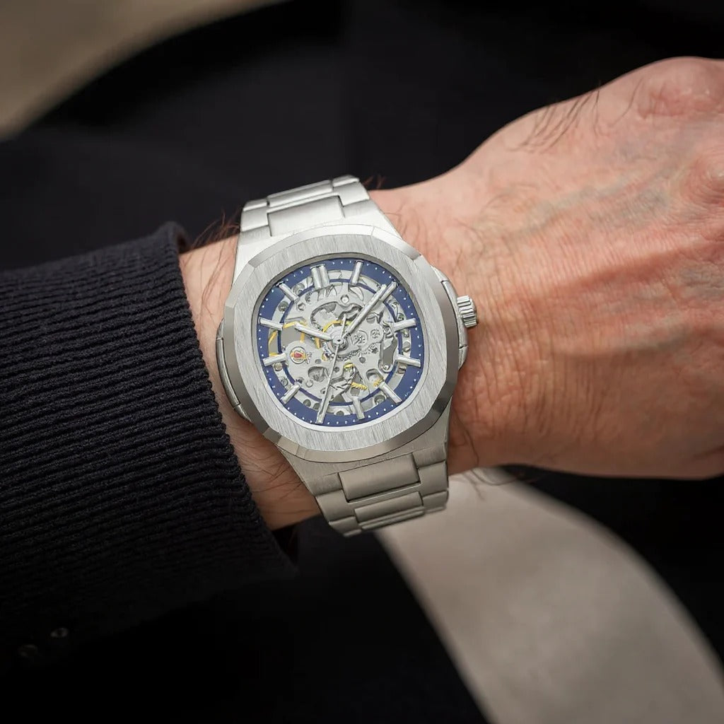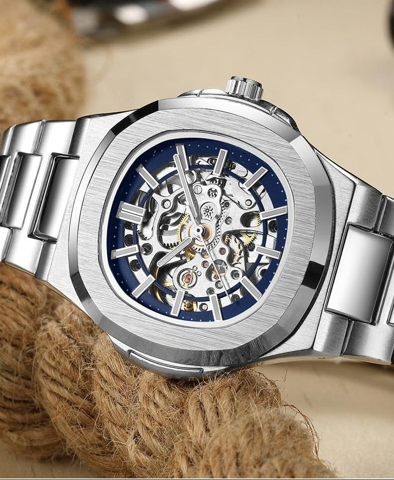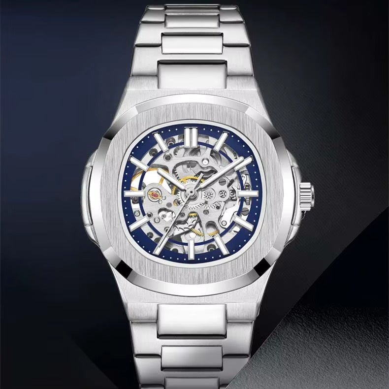 - Откройте для себя мужские часы с современным и элегантным дизайном, которые сочетают в себе роскошь и высокую производительность. Циферблат выполнен в стиле «скелетон», открывая внутренний механизм и создавая привлекательный вид, придавая вашему образу уникальность и отражая утончённый вкус.