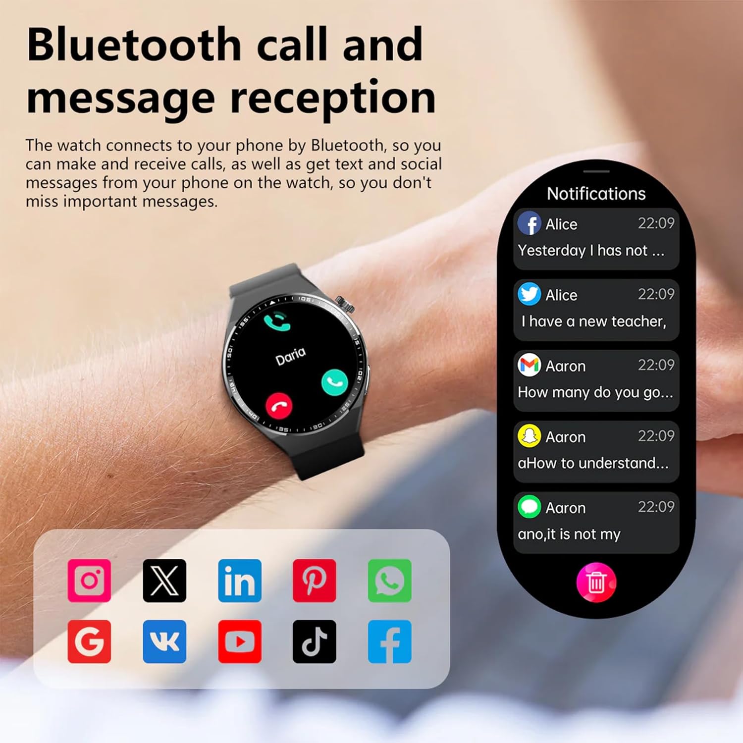 - Bluetooth-звонки и умные уведомления: Смарт-часы оснащены современным Bluetooth 5.3, обеспечивающим чёткие и стабильные звонки прямо с запястья. Синхронизация звонков, контактов и уведомлений из социальных приложений позволяет оставаться на связи во время работы, тренировок и путешествий без постоянной проверки телефона.