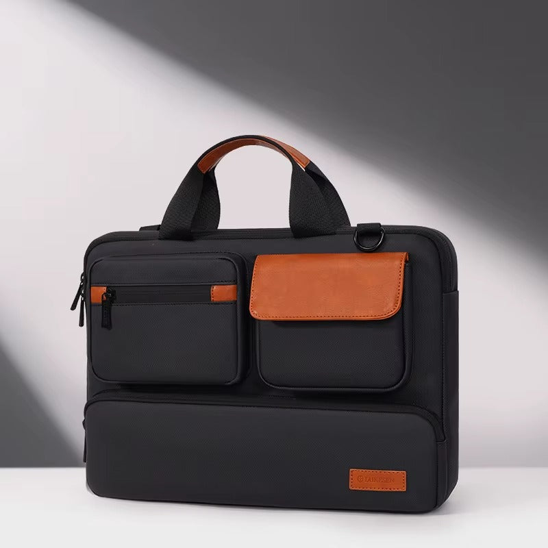 - Дизайн и Эстетика: Эта сумка для ноутбука TAIKESEN разработана для повседневных поездок и путешествий, отличаясь большой вместительностью и удобством переноски. Она имеет профессиональный черный вид с элегантными вставками из коричневой искусственной кожи на ручках и клапанах карманов, что сочетает в себе моду и практичность.
